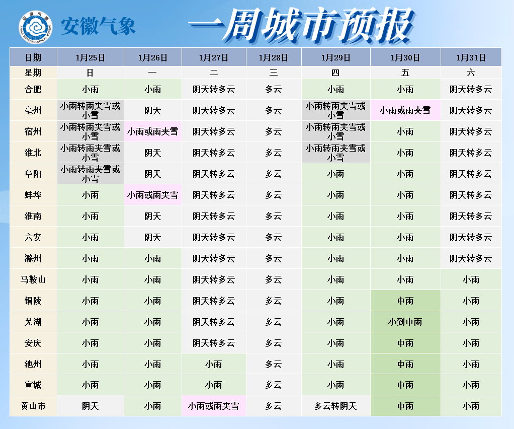 据安徽省气象台最新预报,25日至27日我省自北向南有一次降水过程,其中25日夜里淮河以北部分地区有小雨转雨夹雪或小雪,26日淮河以北东部有雨夹雪,27日皖南山区有雨夹雪或小雪。30日前后我省还有一次弱雨雪天气过程。