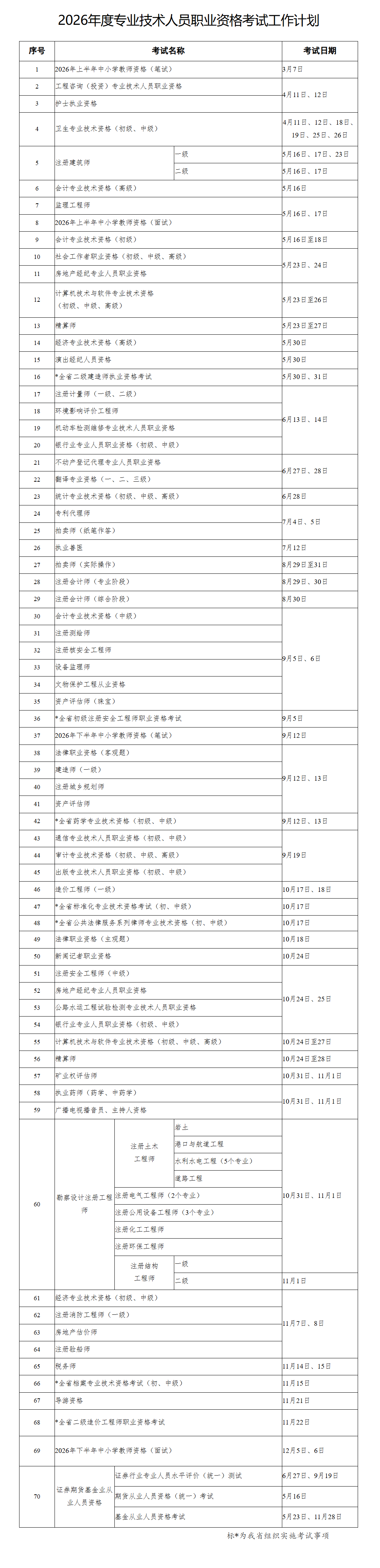 根据考期安排,2026年我省开年“第一考”为3月7日举行的上半年中小学教师资格笔试;4月起,咨询工程师、护士执业资格、卫生专业技术资格等多项热门考试将陆续开考。备受建筑行业关注的全省二级建造师执业资格考试定于5月30日、31日举行,目前报名通道已开启,有意报考的市民请抓紧完成相关流程。其余热门考试,例如,会计专业技术资格考试将按等级分批次举行,高级资格5月16日开考,初级资格为5月16日-18日,中级资格安排在9月5日-6日;计算机技术与软件专业技术资格考试分为5月23日至26日,下半年为10月24日至27日;执业药师(药学、中药学)考试定于10月31日、11月1日举行。