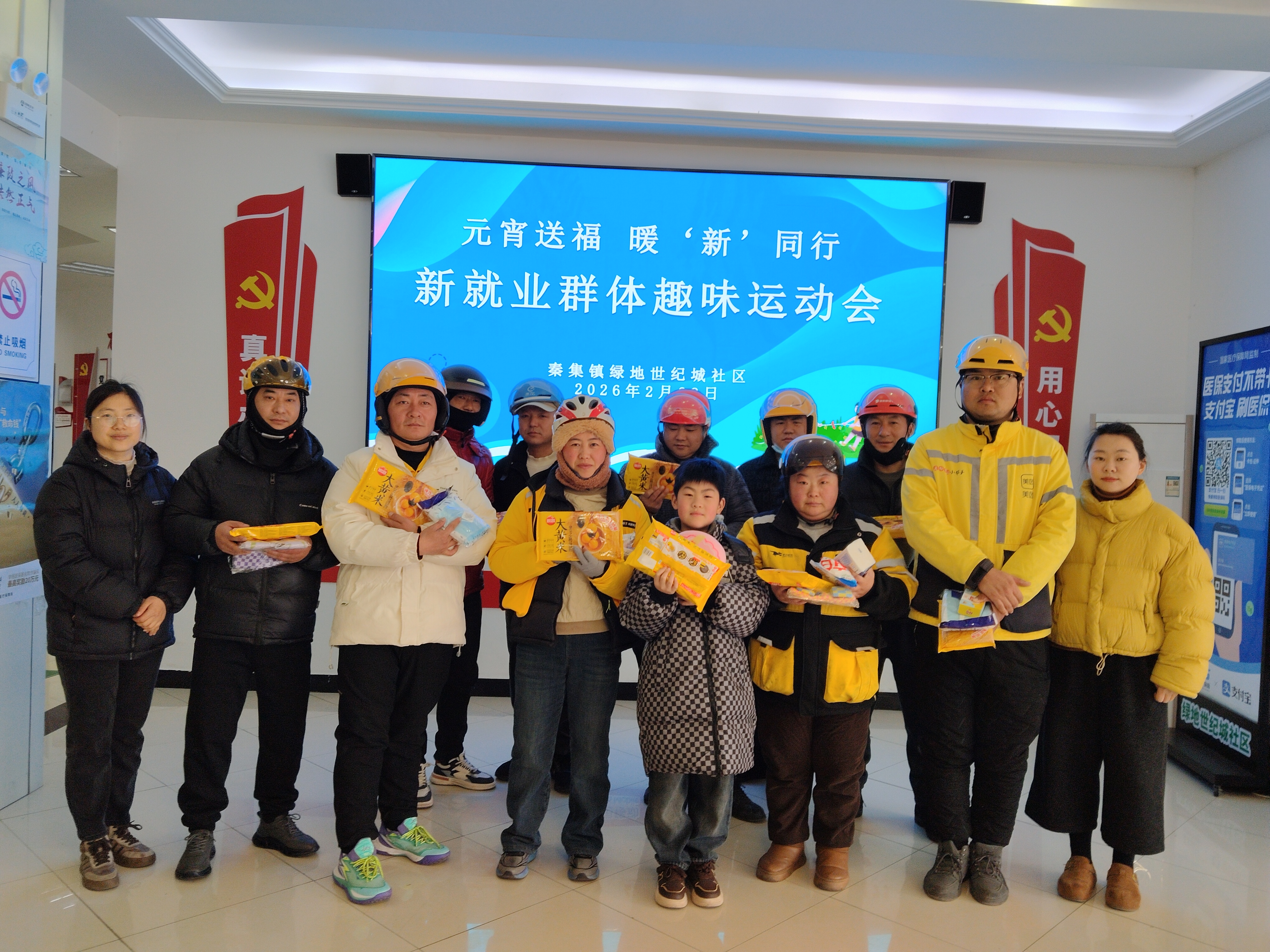正月里的风还带着寒意,蚌埠市秦集镇绿地世纪城社区“党群驿站•淮畔新港湾”里却暖意涌动。这里正举办“元宵喜乐会”,快递员、外卖骑手们暂别奔波,成了活动的主角。