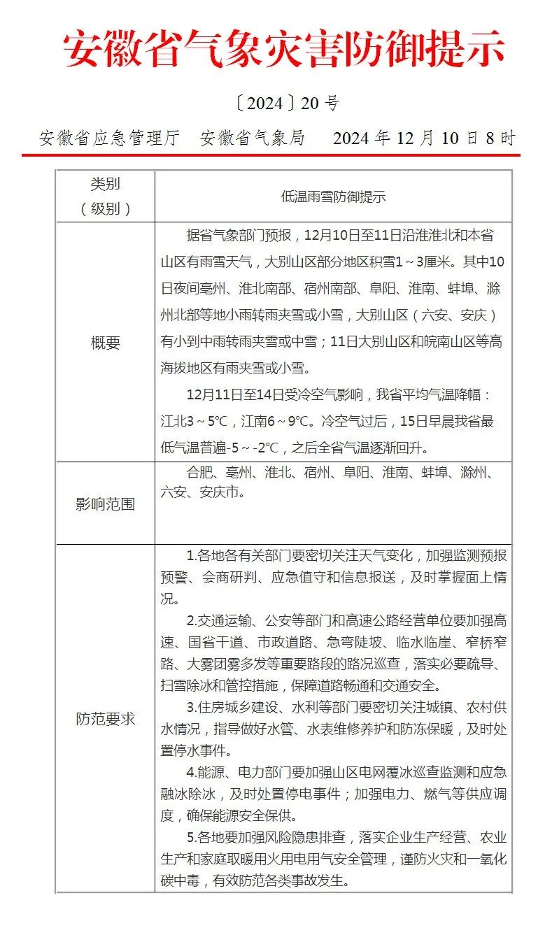 影响范围涉及10个市!安徽发布低温雨雪防御提示