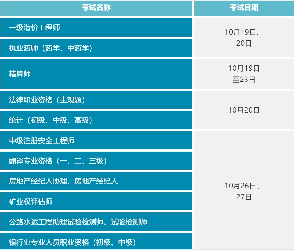10月专业技术人员职业资格考试时间表来了