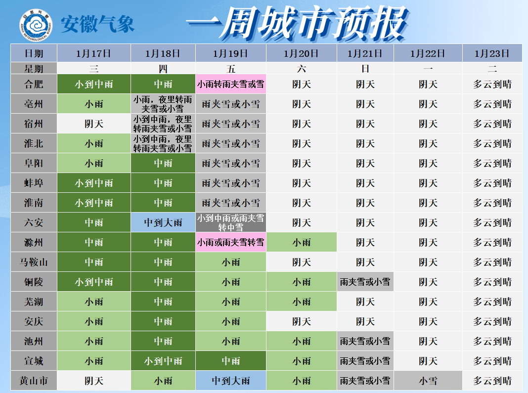 气象预报1月18日至19日我省将有明显雨雪天气,18日夜里开始淮北地区将出现雨夹雪或雪