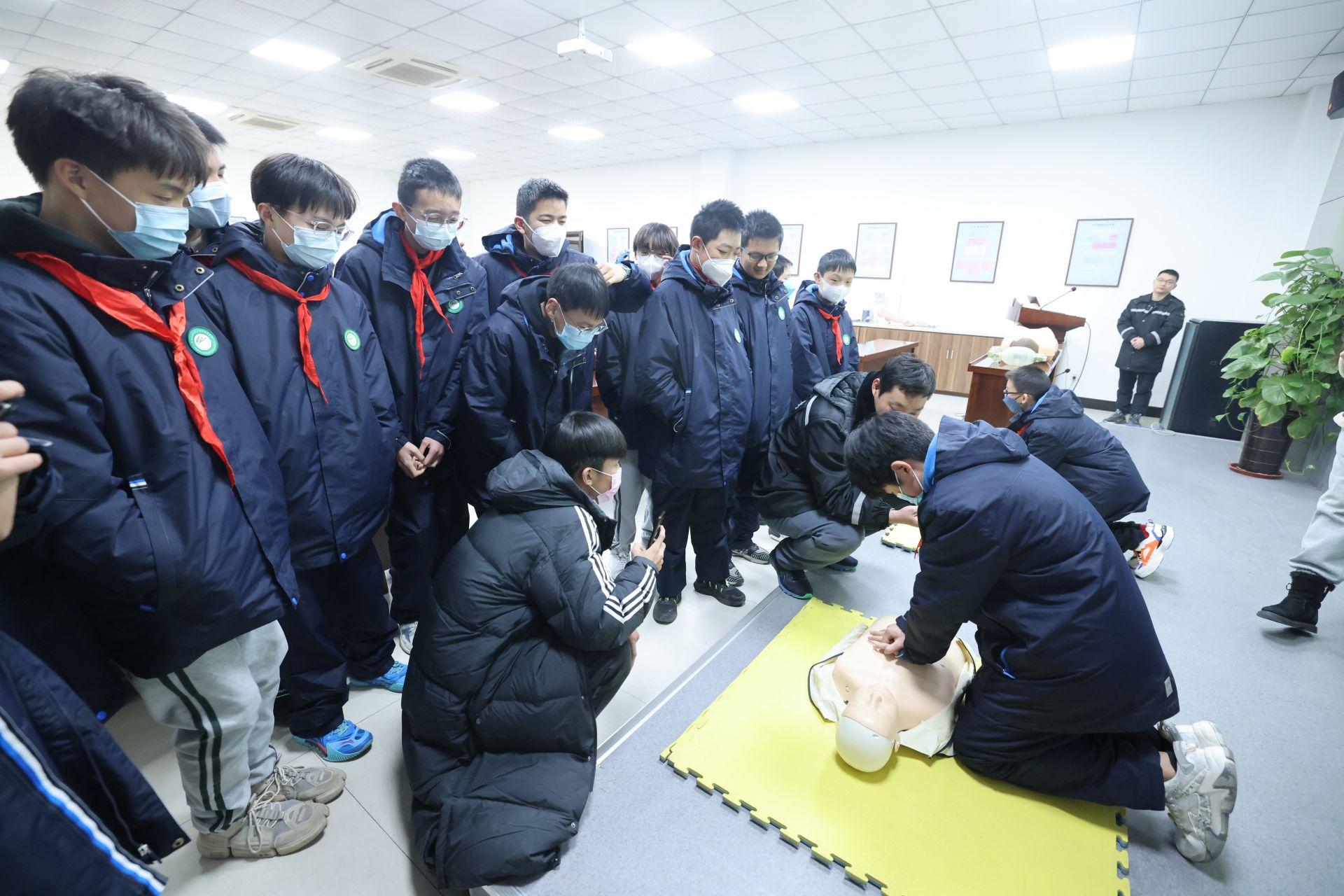 在培训老师的带领下,同学们使用模拟人进行了心肺复苏练习,大家在仿真的实践情景下掌握了心肺复苏的急救知识和技巧。