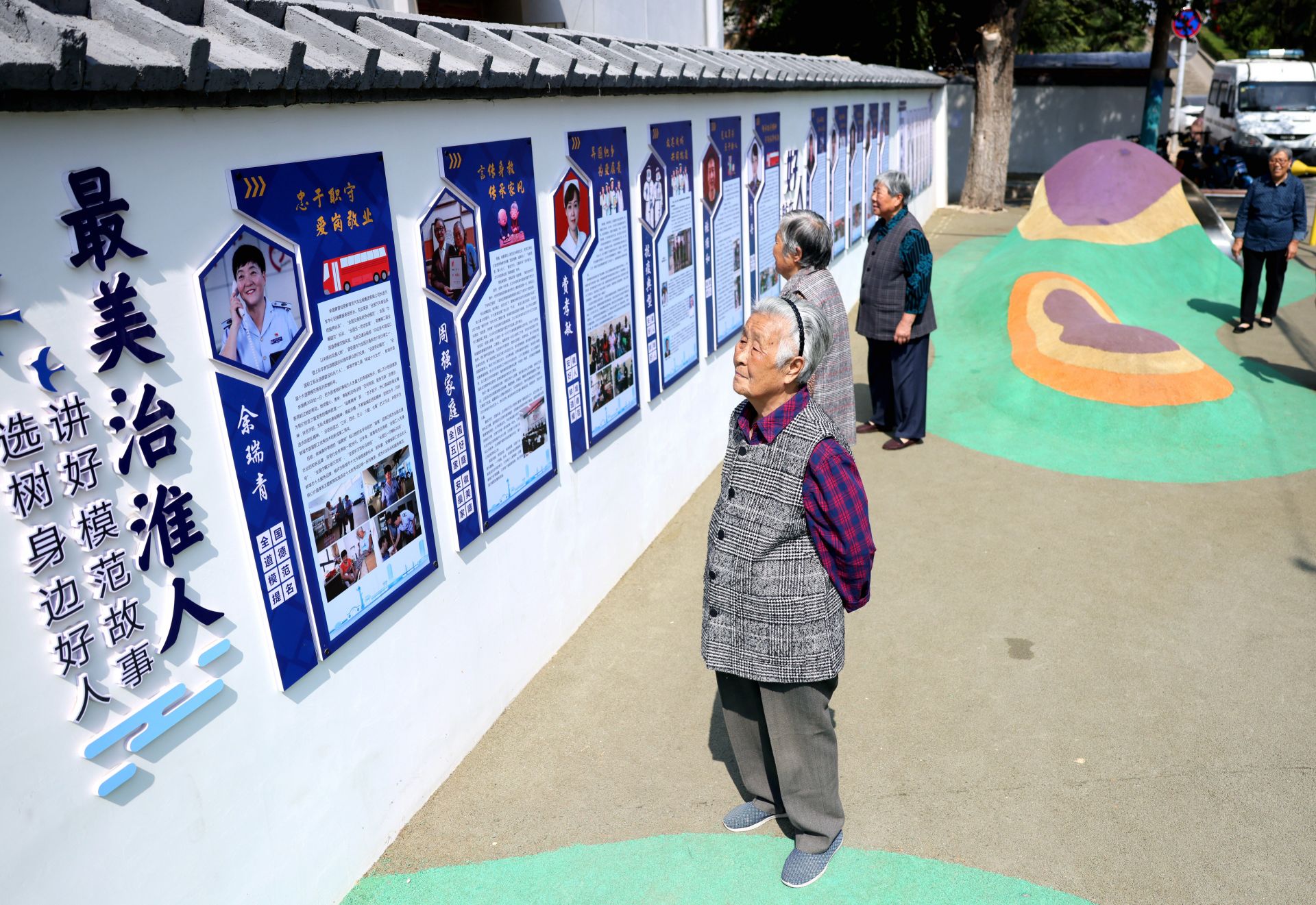 广场上义诊活动有序开展,一旁的文化长廊,也吸引了不少居民驻足观看。