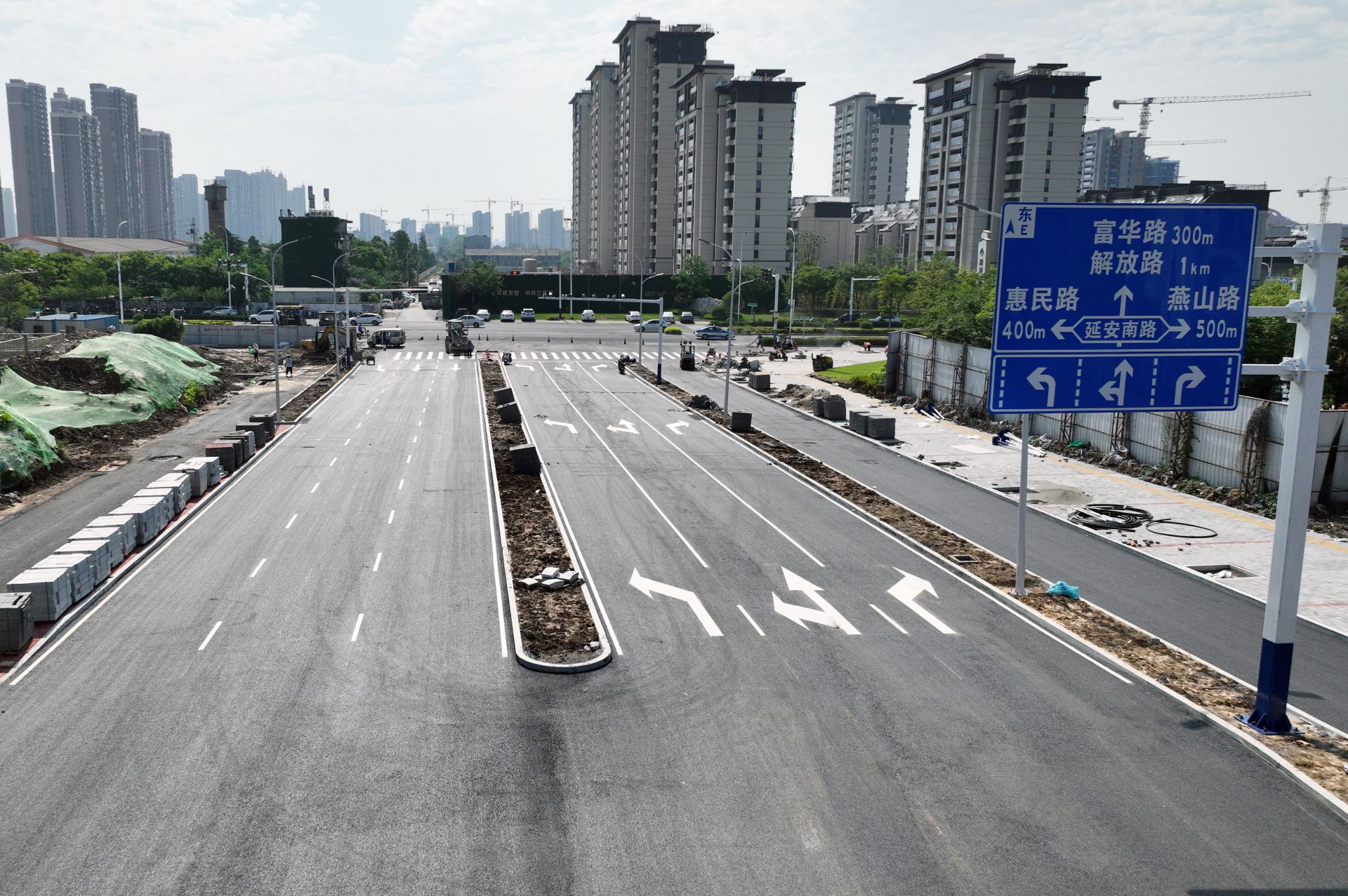 昨日,记者分别来到货场六路(虎山东路至延安南路)、南湖路(雪华路至迎滨路)道路工程现场,看到沥青铺设、交通标线等均已完成,为今日开放交通做好了准备。
