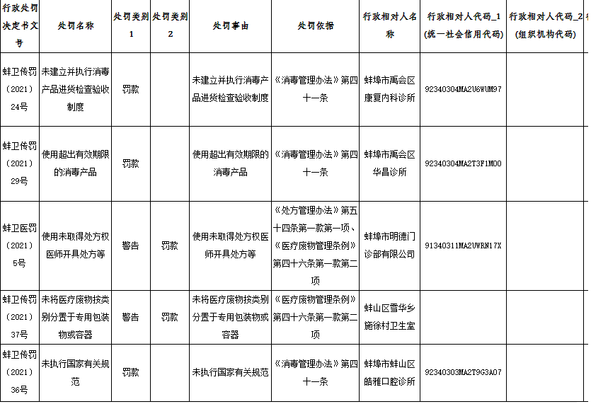 市卫健委公布最新一批行政处罚信息,蚌埠市德润旺日用品厂、禹会区喜迎门社区卫生服务中心、蚌埠市中泰大酒店有限公司、蚌埠市红十字会医院、龙子湖区东升街道淮建社区卫生服务站、龙子湖区同仁医院、小蚌埠镇荷花园社区卫生服务站因违规行为被处罚。