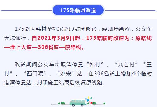 改道期间公交车将取消停靠“韩村”、“九台村”“王村”、“西门渡”、“姚宋”站,在306省道上增加4个临时港湾停靠站,封闭施工结束后恢复原线路。