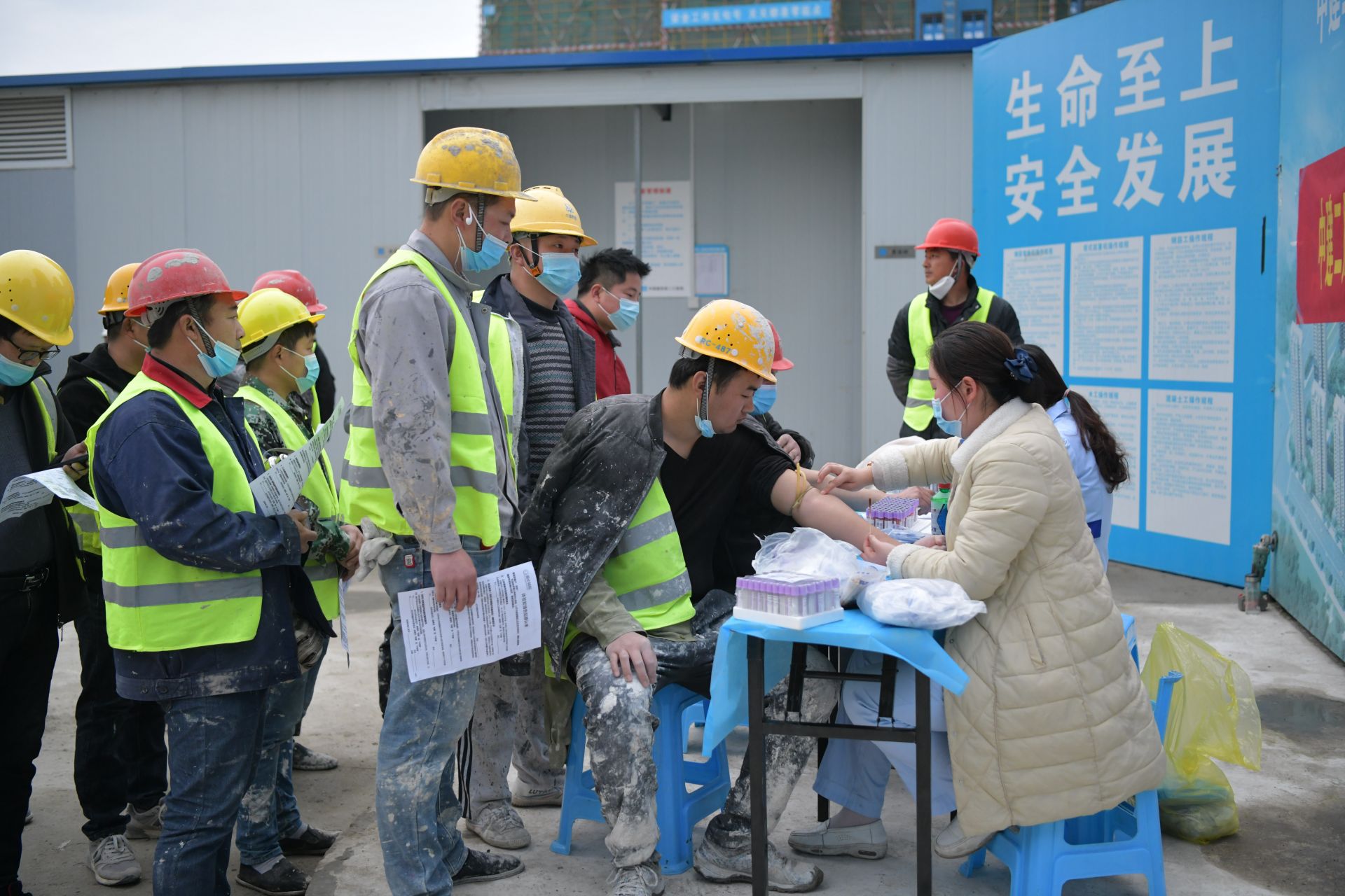 3月5日,体检车开进中建二局安徽分公司蚌埠兰凤路安置小区工地,医护人员为300多名农民工兄弟体检,项目涵盖DR、血压检测、心电图检测等。