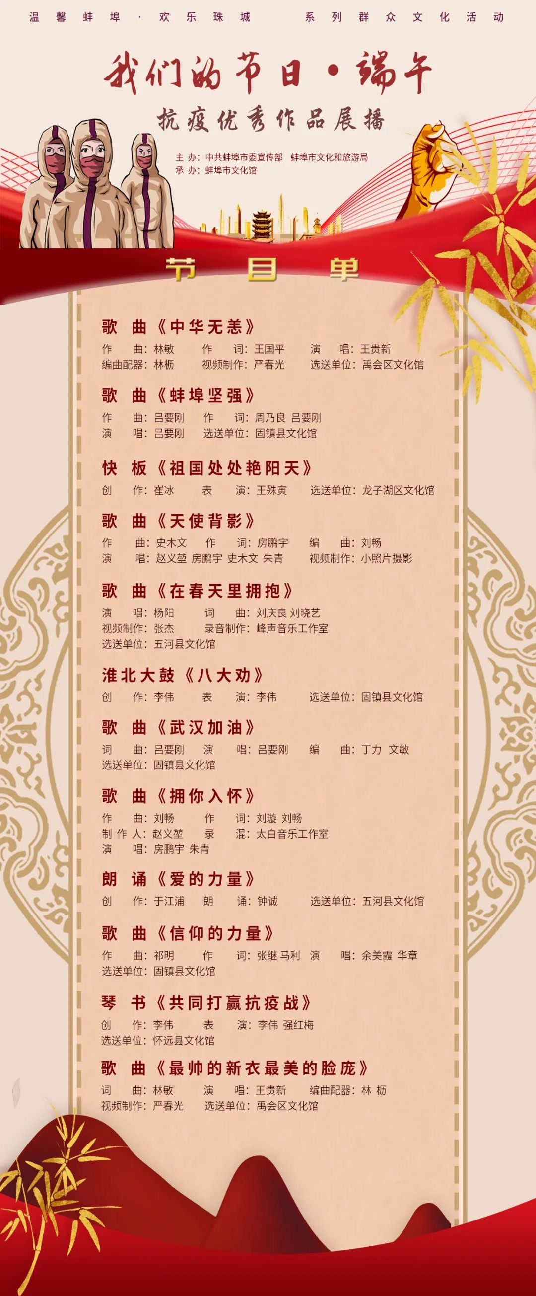 蚌埠市文化馆精选出了12个优秀抗疫作品,将于6月25日线上举办“我们的节日——端午”抗疫优秀作品展播。