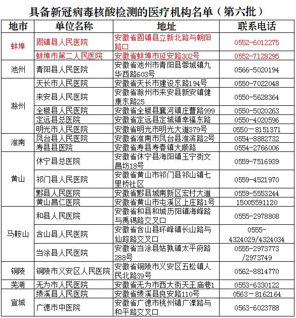 安徽省具备新冠病毒核酸检测的医疗机构名单(第六批)公布