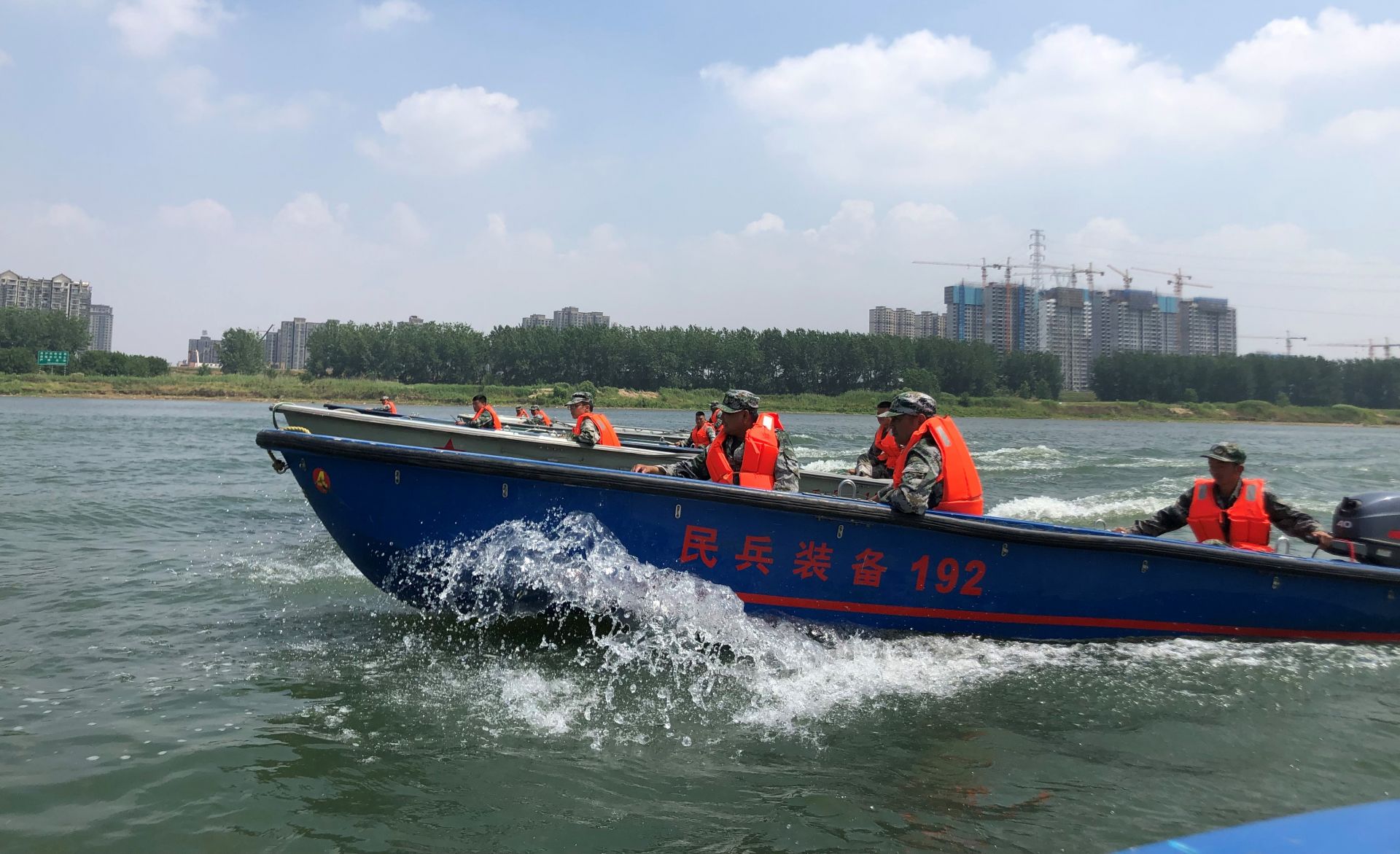 这边水上救援正在展开,那边岸上一队民兵正将一艘冲锋舟抬至岸边,熟练地进行挂机操作,再合力推舟下水,很快一艘搭乘救援人员的冲锋舟驶入水域,加入救援队伍。