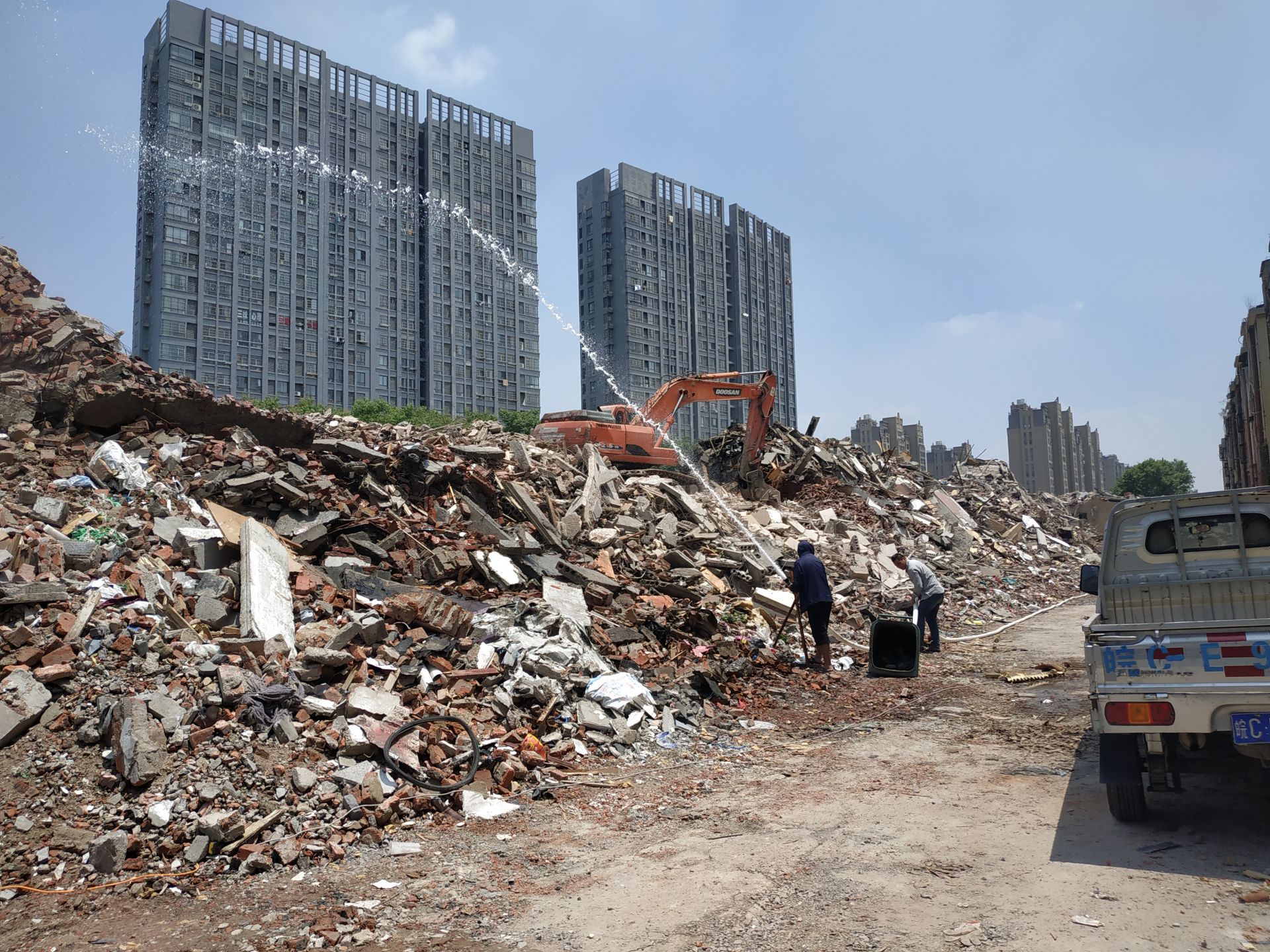 施工方:降尘效果有限,尽快完工,减少影响 在拆迁现场,记者见到了施工队伍的负责人郭先生,“拆迁扬尘没有太好的办法,我们虽然安排了这几支高压水枪,24小时不停喷水降尘,但效果有限,只能管局部。”
