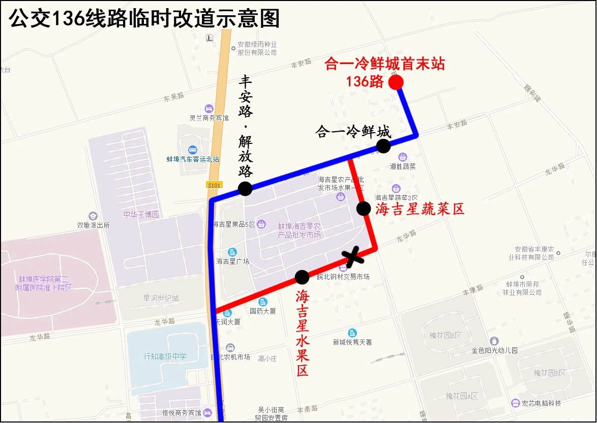 因盛世路道路拥堵、龙华路部分道路损坏严重,自4月3日起,公交136路部分走向由:“合一冷鲜城首末站—丰安路—盛世路—龙华路—解放路—原线路”调整为“合一冷鲜城首末站—丰安路—解放路—原线路”。