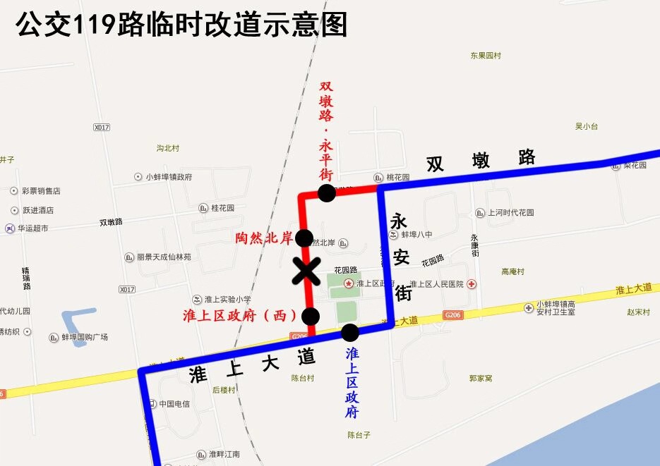 改道期间公交车将取消停靠“淮上区政府(西)”、“陶然北岸”、“双墩路·永平街”站,临时双向停靠“淮上区政府”站。