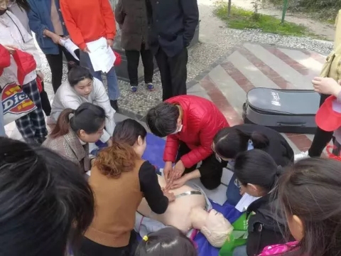 志愿者们用通俗易懂的语言讲解了心肺复苏、意外事件处置等急救知识,并就如何调整体位、打开气道、判断呼吸、人工呼吸、胸外心脏按压等应急救护方法进行了现场操作演练。