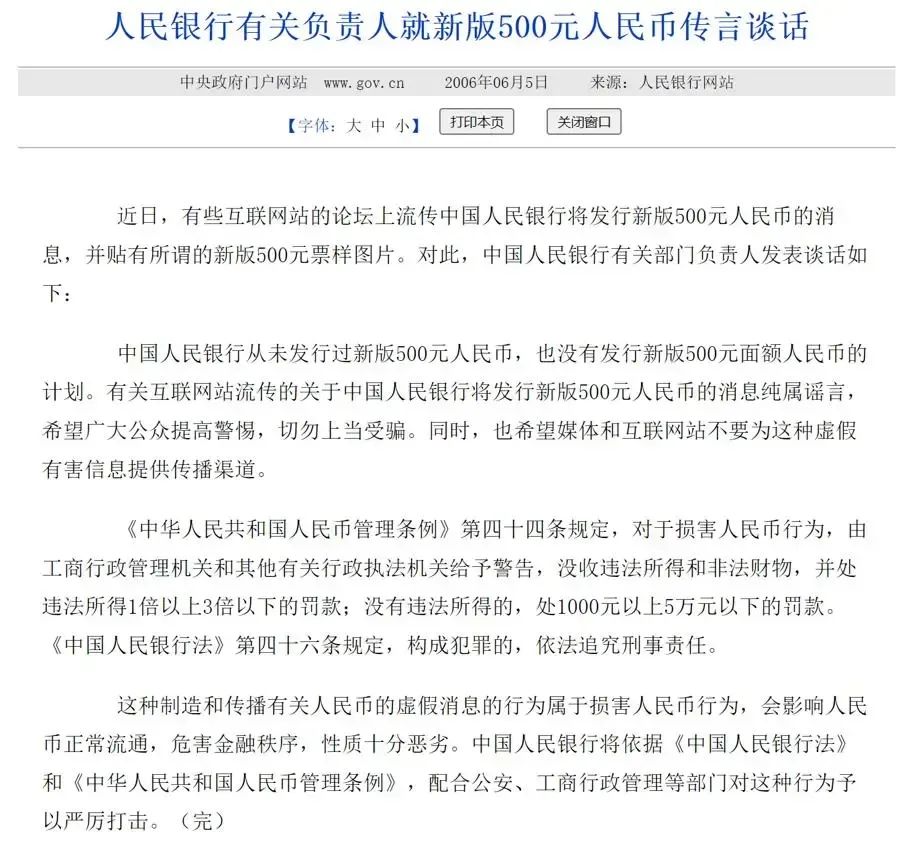 其中,1000元的票样在2016年就曾热传。当时,央行明确回应:央行尚没有发行大面额人民币的打算,该票样纯属伪造;至于500元的票样,早在2006年就被官方辟谣称,系网民编造。央行指出,制造和传播有关人民币虚假消息的行为属于损害人民币行为,会影响人民币正常流通,危害金融秩序,性质恶劣。