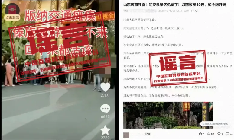 详情:近日,互联网平台出现“游客在景洪市傣族园景区排队上车至深夜,版纳交通瘫痪”““山东济南狂喜!趵突泉景区免费了!以前收费40元,如今敞开玩”等信息,引发关注。经核实,傣族园相关网传视频部分内容为旧闻翻炒,与当前景洪市交通运行实际情况严重不符。而趵突泉景区目前严格按照既定收费标准执行正常收费管理,各类免票、优惠政策按现行规定正常实施,网传“趵突泉景区免费”为虚假信息。(来源:“网信云南”微信公众号、山东互联网联合辟谣平台、济南互联网联合辟谣平台)
