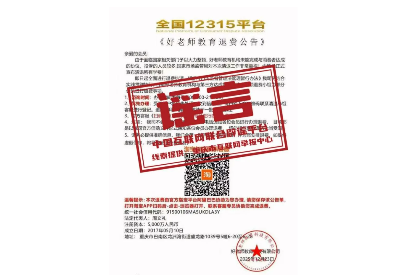 “全国12315平台发布退费公告”不实——今日辟谣(2026年1月4日)