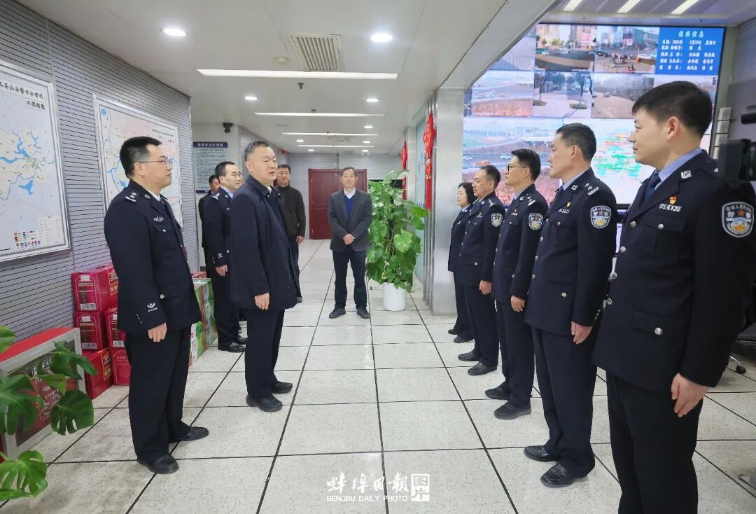 蚌埠发布客户端讯(蚌埠市新闻传媒中心记者 顾楷/文 陈昂/图)2月15日是春节假期第一天,当天上午,市委书记马军走进市公安局和部分生产企业,督导调研春节期间企业运行、安全生产、值班值守和维稳安保等工作,并看望慰问一线在岗职工,向大家送上新春的诚挚问候和美好祝福。市委常委、政法委书记、市公安局局长熊言松参加。