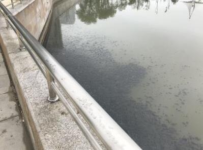 图为龙子湖体育公园附近龙子湖水面上大片的黑色漂浮物,散发着恶臭。