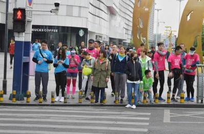 工农路与东海大道交口,毅行者遵守交规,按红绿灯指示通行。