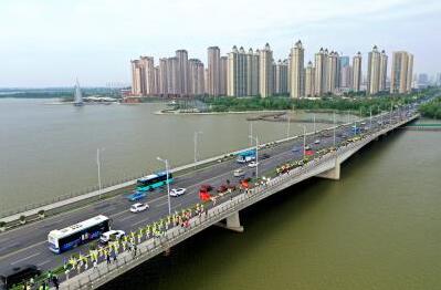 龙湖大桥,毅行者有序通过,成为路边靓丽风景。