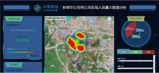 同时,分公司与市公安局合作,经过1个月的开发与调测,制作《蚌埠市公安局公共区域人流量大数据分析》平台,提供现场人流量趋势以及工作地、居住地、其他等人口分析,以便公安部门科学掌握本地及外地游客数量情况。