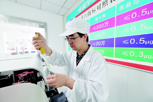 5月14日,蚌埠和平乳业有限责任公司技术人员在品控室检测产品。在全省奶业发展的“坐标系”中,蚌埠是当之无愧的优势产区,奶牛养殖量和生鲜乳产量均位于全省首位:2018年牛奶产量20.01万吨,较2017年增长32.9%,占全省总量由2016年的47.87%上升到64.95%;奶牛存栏5.42万头,较2017年增长1.2%,占全省总量42.36%。