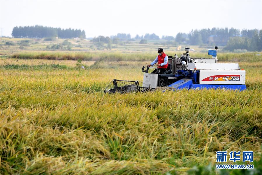 在安徽凤阳小岗村,农民驾驶收割机收割水稻(2018年9月27日摄)。 新华社记者 刘军喜 摄