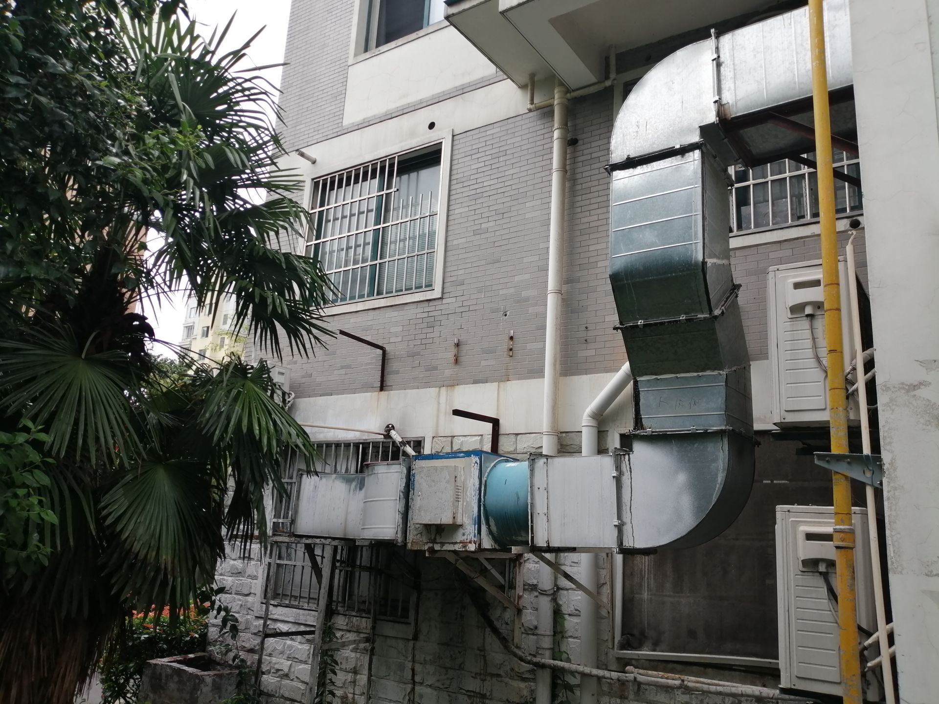 玫瑰花园小区一号楼西侧,饭店油烟管直接对着楼道口吹。