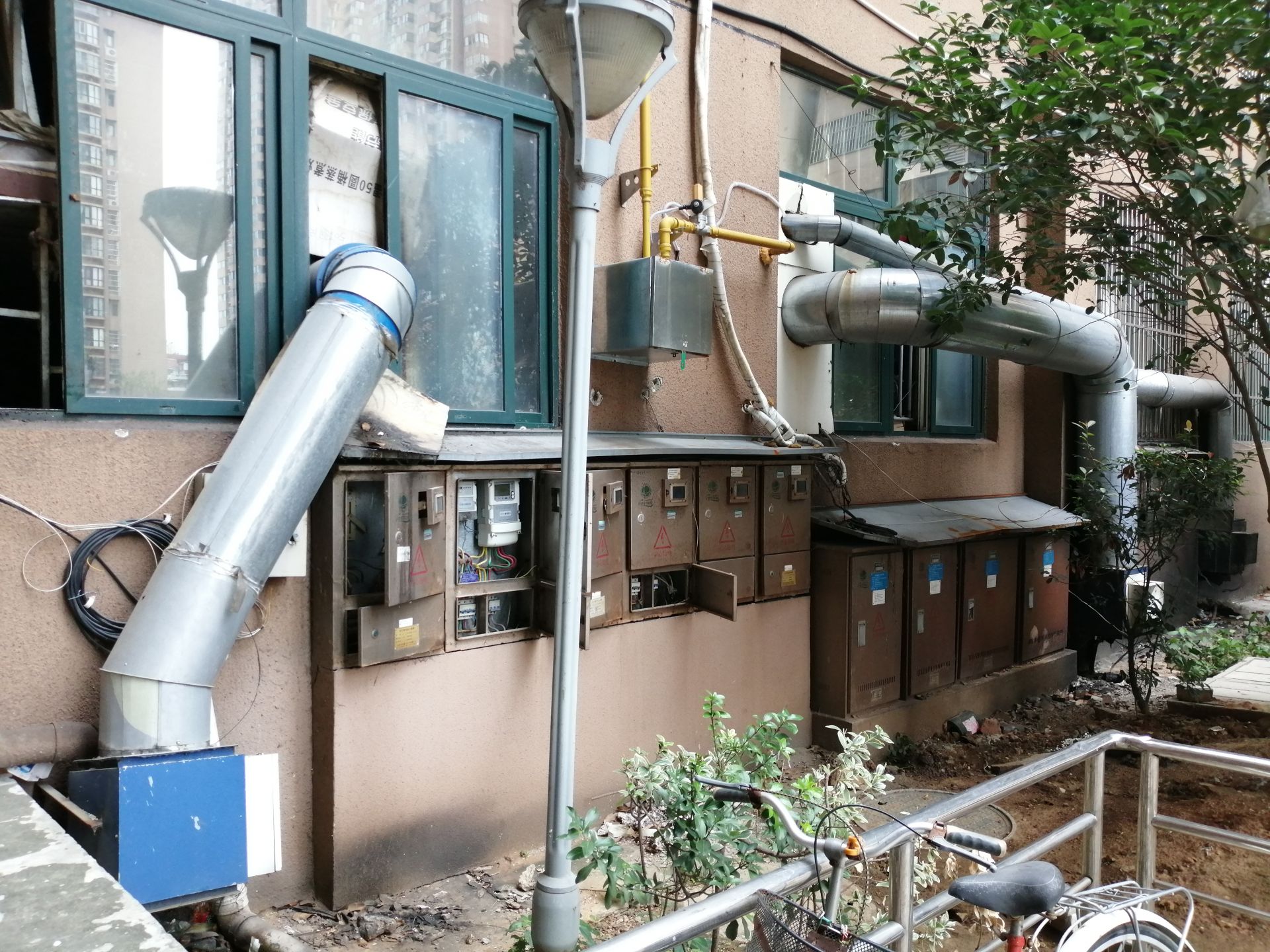尚庭花园小区1号楼外面饭店通往小区的油烟管道。