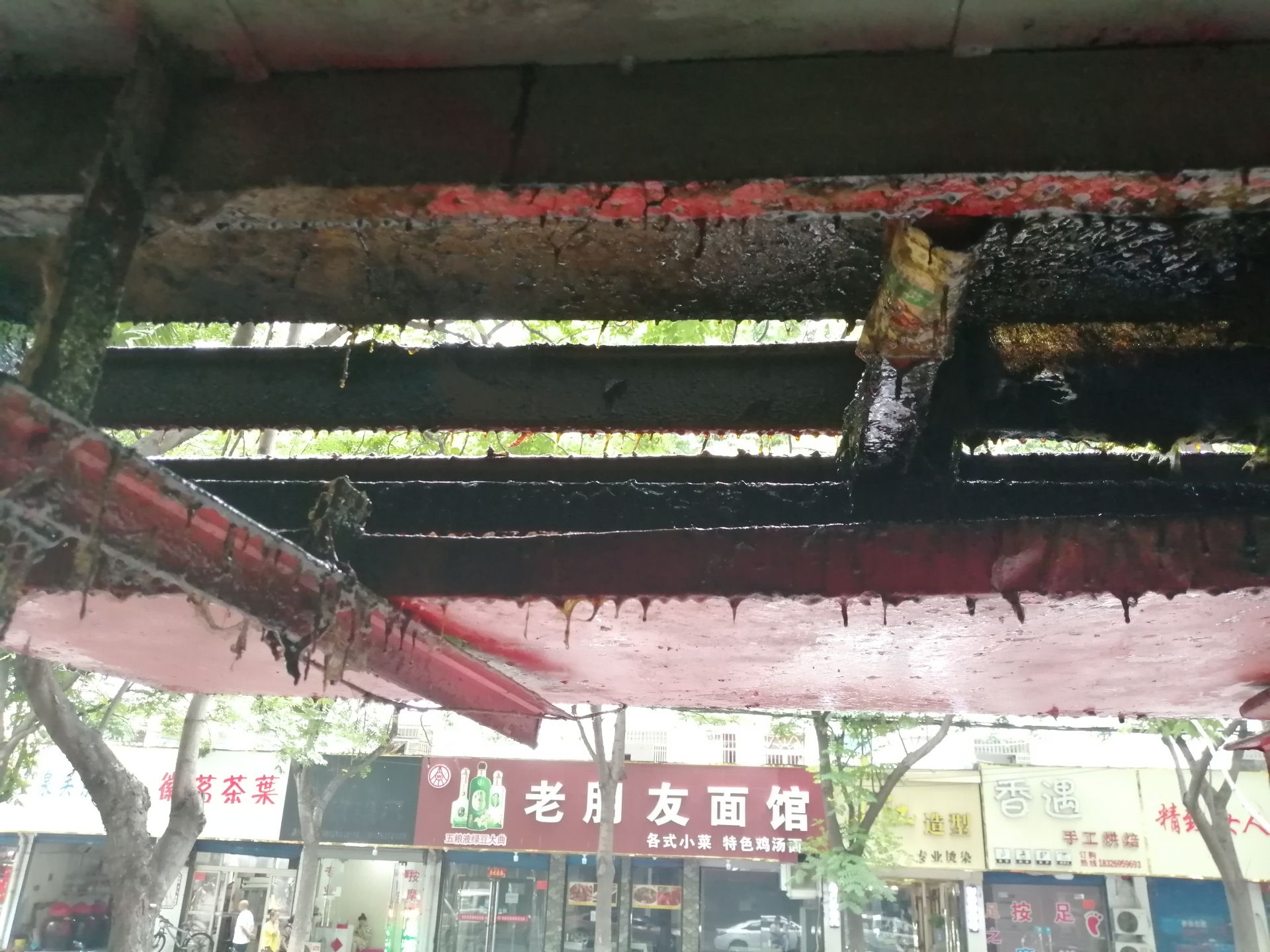 纬一小区10号楼下一家饭店油烟直接排到人行道,黑色油污滴的到处都是。