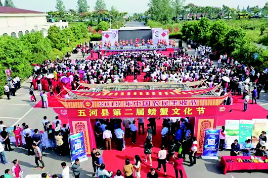 9月24日,第二届五河螃蟹文化节在风景秀丽的五河县沱湖举行,现场举办了五河特色农副产品展示、庆丰收文艺演出、十佳助力脱贫带头人颁奖、十佳农村致富带头人颁奖、蟹王蟹后争霸赛、捆螃蟹比赛、钱杆舞展演、农民趣味运动会等丰富多彩的活动,展示与分享丰收成果,丰富农民精神文化生活。