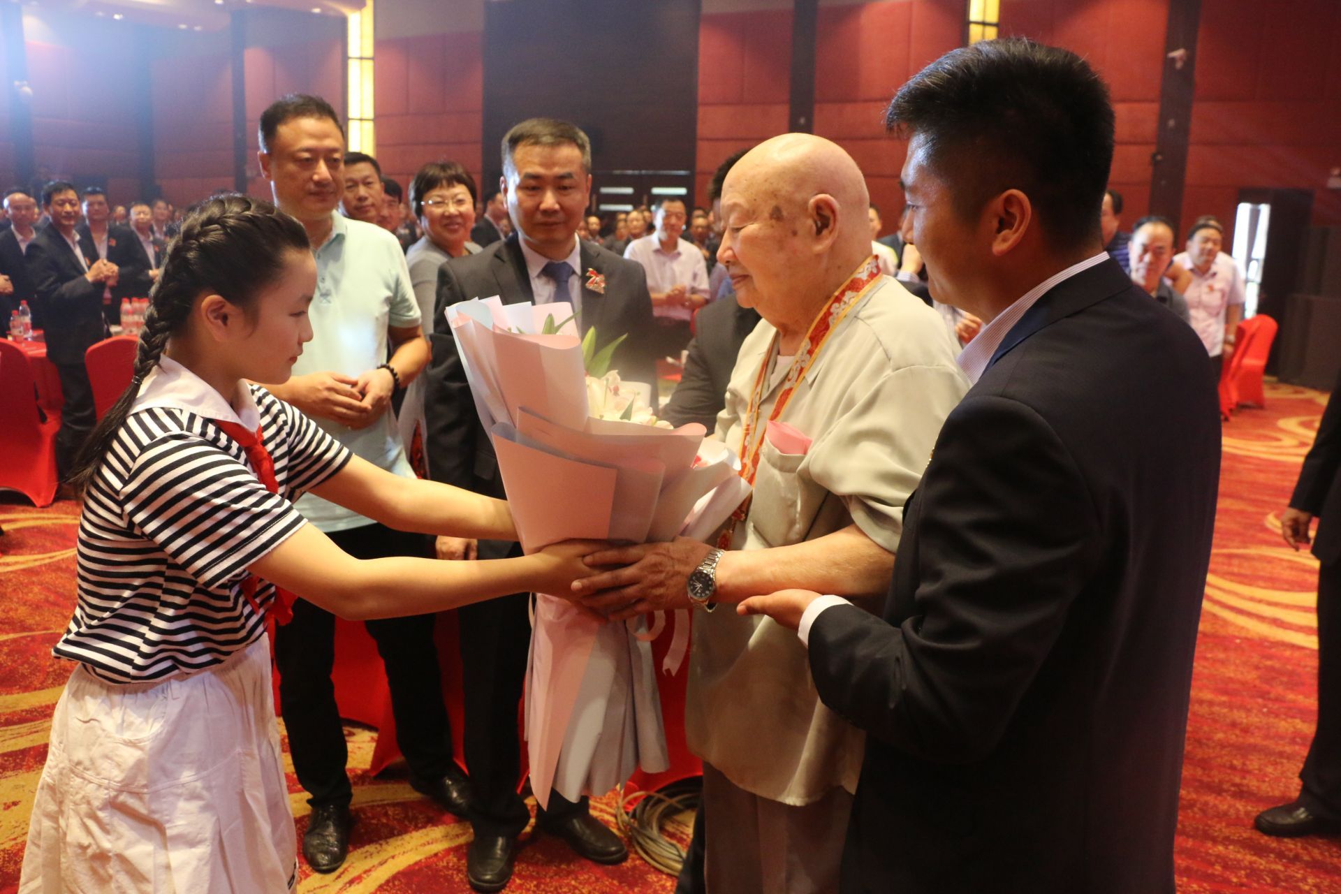 庆典伊始,全体与会人员起立齐唱《中华人民共和国国歌》。随后,主持人依次介绍出席本次庆典的领导及嘉宾,在介绍到最后一位嘉宾时,主持人激动地说:“他几十年来关心、惦记着蚌压成长和壮大,他今年已97岁高龄,他就是蚌压第一任厂长王明义老先生!”。在工作人员的搀扶下,王明义老先生缓缓步入会场,接过少先队员的鲜花,全场人员起立并报以最热烈的掌声。