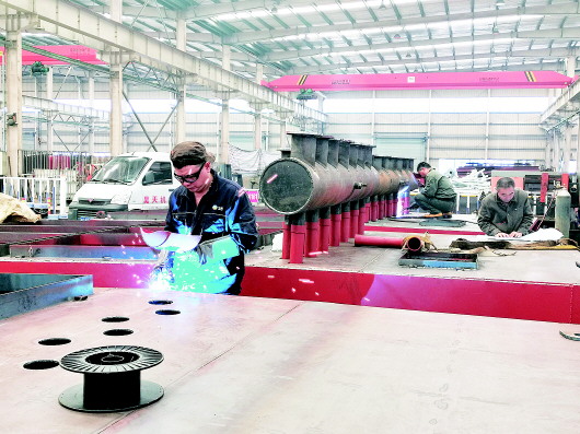 工人正在生产环保设备部件。 记者 刘晨 摄