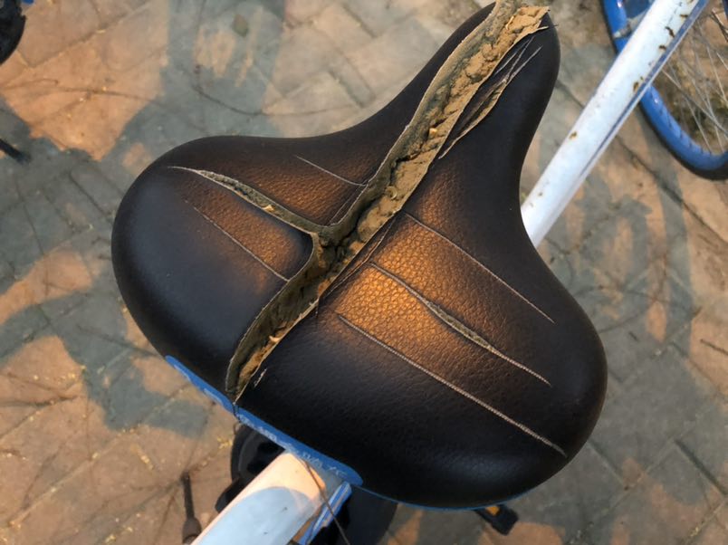 共享单车的坐垫被划出了深深的伤口。