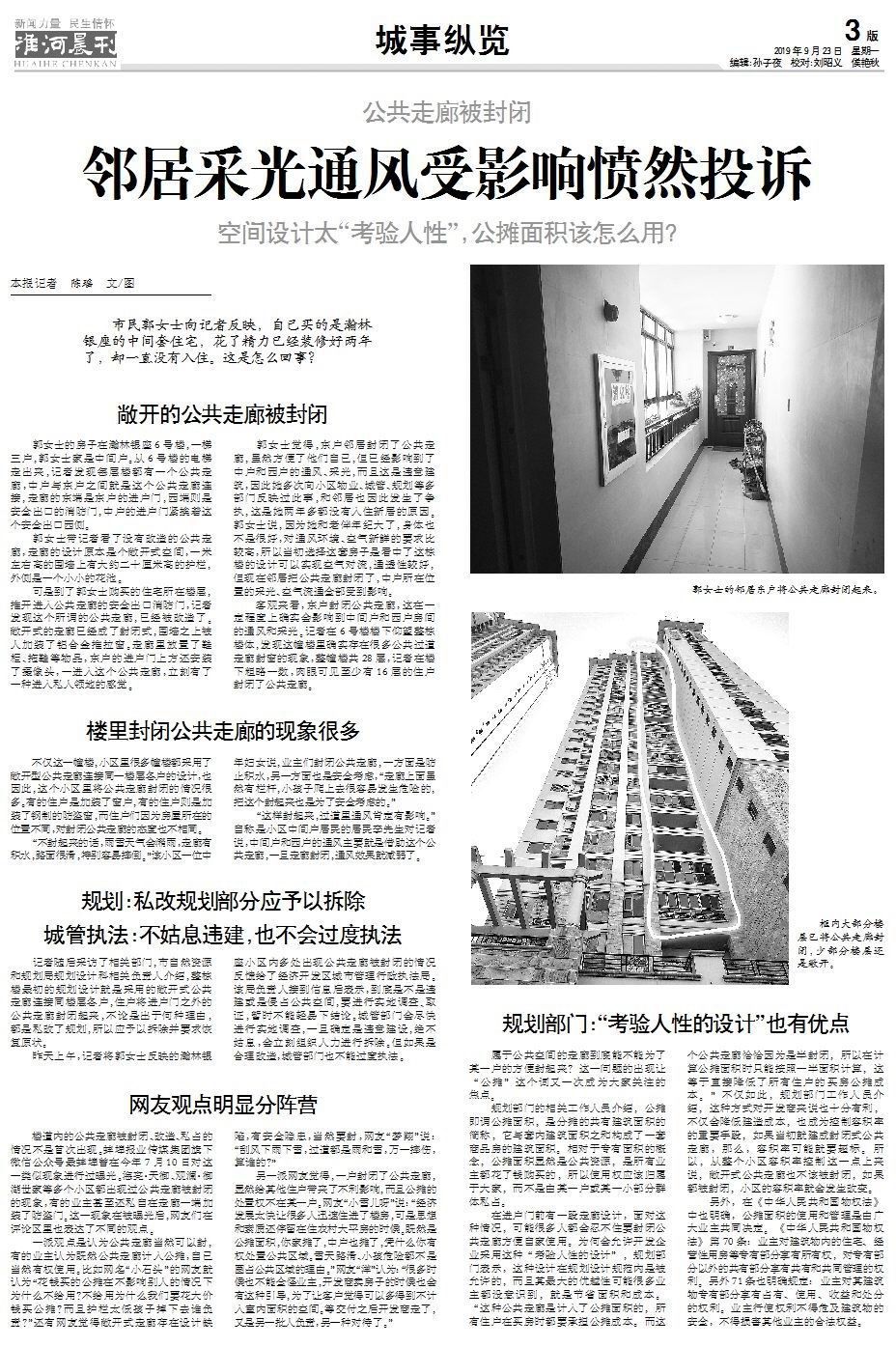 9月23日本报在3版刊登《邻居采光通风受影响愤然投诉》的报道。边户业主封闭公共走廊的现象在我市很多小区越来越多地出现,公共走廊到底能不能封、该不该封,业主们因为立场不同、利益不同,所持的观点不同。公共走廊被封闭到底算不算违建,相关部门的认定终于出来了。