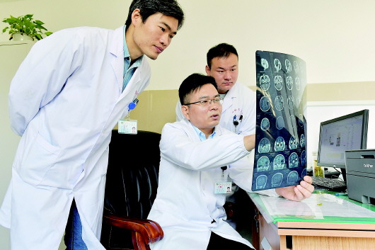 神经外科主任郭传军(中)正在和同事一起看片。今年3月,他作为高端医疗人才被市三院引进,是一名神经外科博士。“学科人才紧缺、优秀医师青黄不接,再加上缺乏激励,想来的人来不了,不行的人走不了……”医院面临的用人困境,曾令主持市二院工作的副院长阙胜利伤透脑筋。