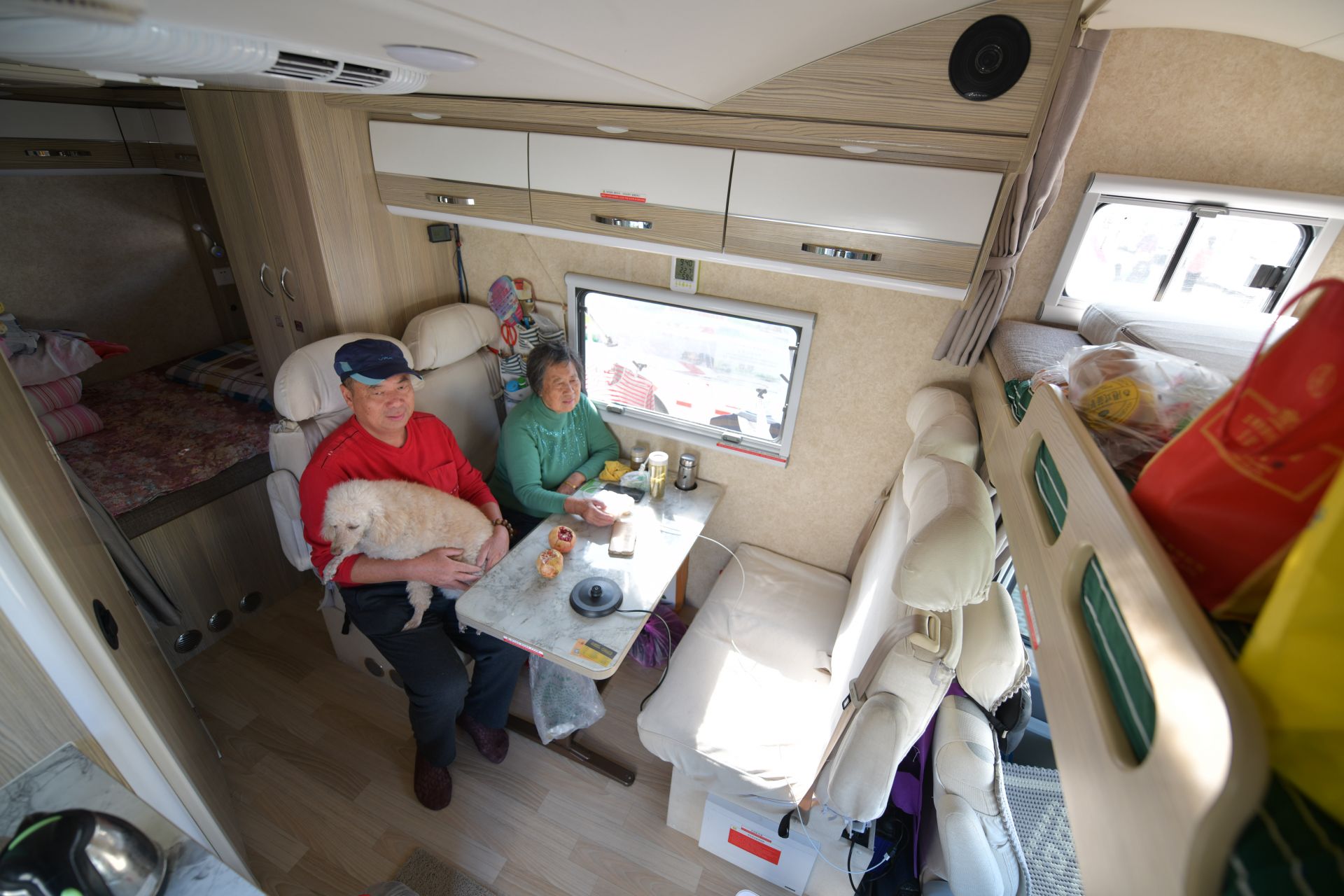 一辆来自马鞍山的房车内,65岁的车主江岸正在和老伴使用自拍杆自拍,车内收拾得井井有条,进门处还有一面照片墙,上面是他们开房车的旅游照片。江岸介绍,他和老伴是同学,5年前退休后,儿女都大了,没啥负担,就买一台B型房车,如今这台更大的C型房车已是第二辆了,几年来开着房车跑遍了大江南北,吃住都在车上,感觉真的是太好了,而下一个目标是明年4月去西藏。