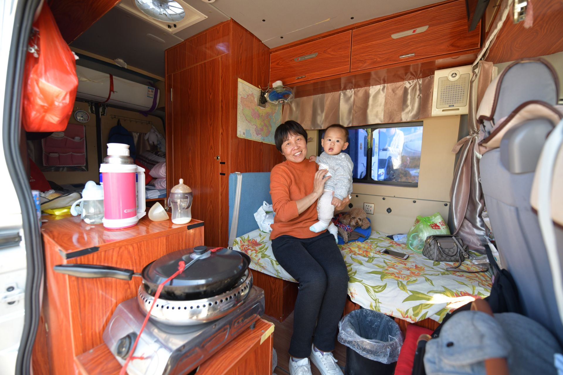 来自阜阳49岁的李伟,第一次带着8个月的孙子坐房车出来旅行。