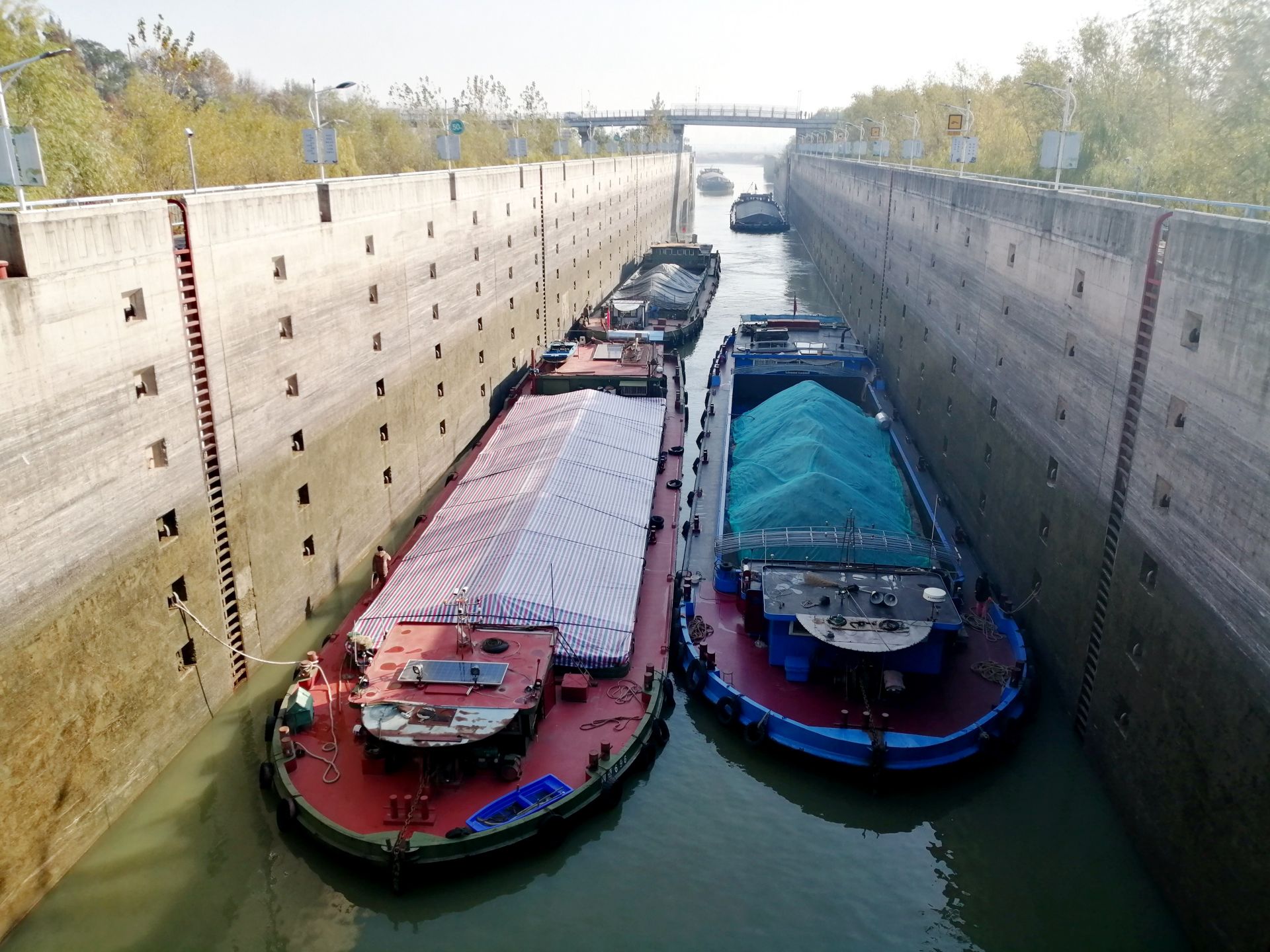 ◤12月4日,正在准备进入闸室等待放行的船只。