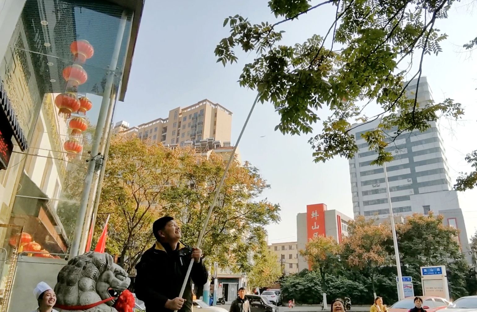 热心市民张先生使用杆子够树叶上的钞票。