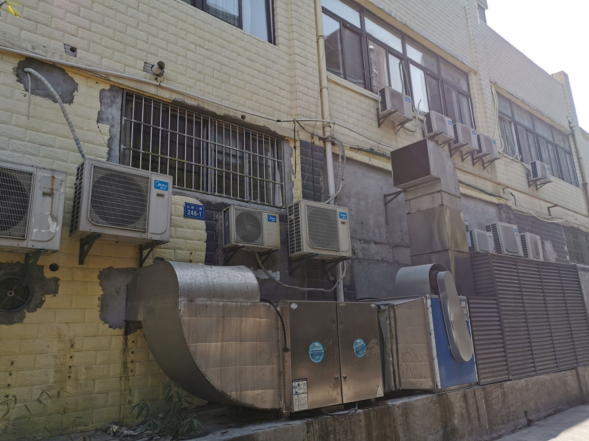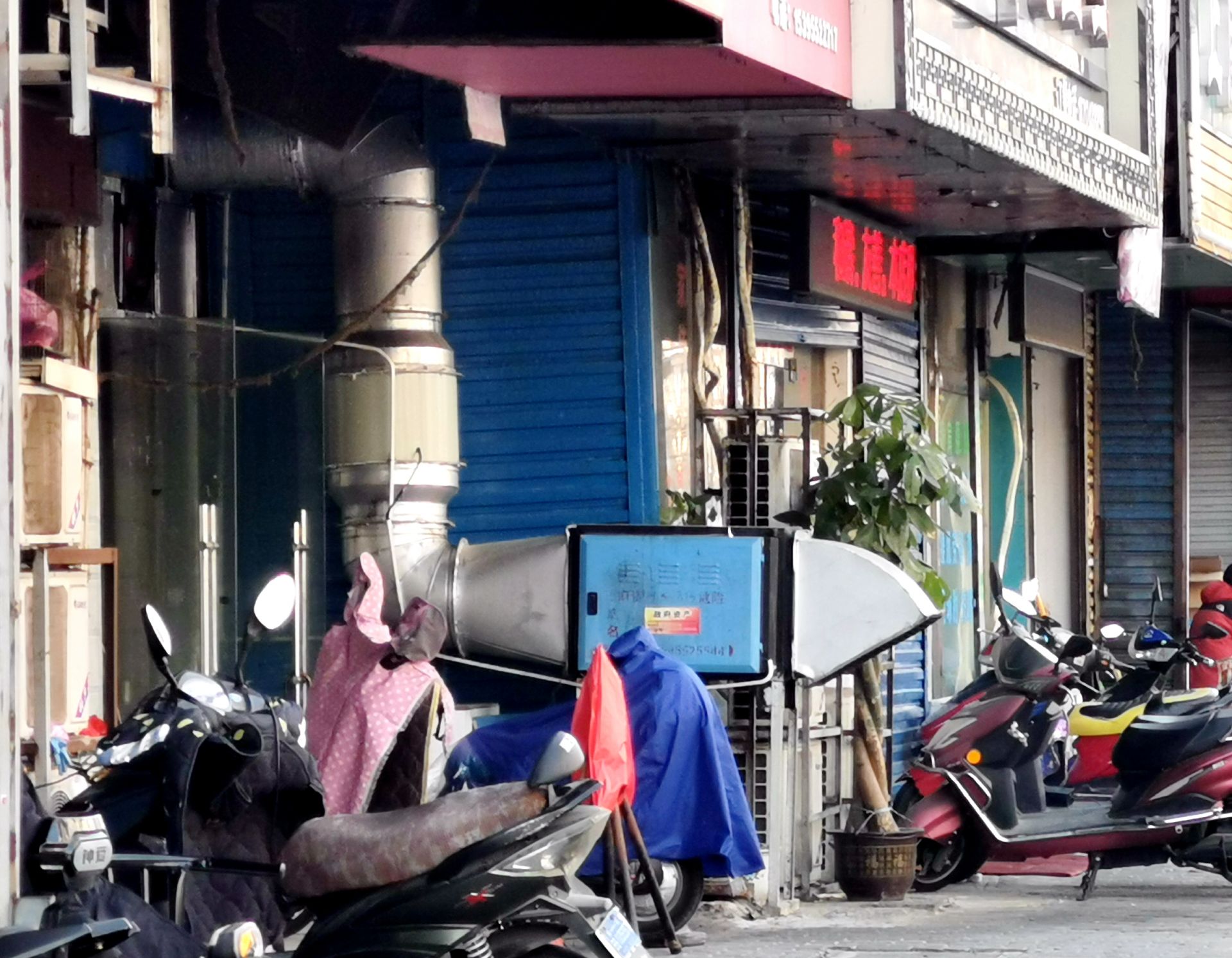 红旗一路润晖苑小区大门口,一家饭店油烟净化设备直排,呼呼响不停。