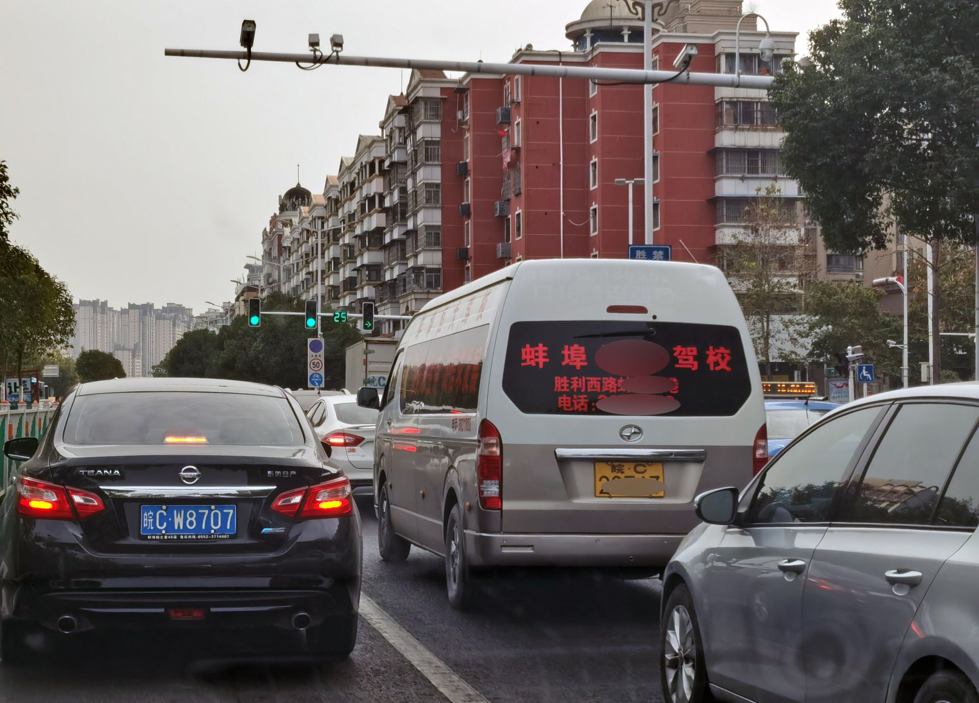 12月15日上午10时30分许,胜利东路与兴业街路口等红绿灯时,一辆商务车后车窗贴有红色字体的驾校地址联系方式等,左侧车身及车窗也同样存在车体广告。