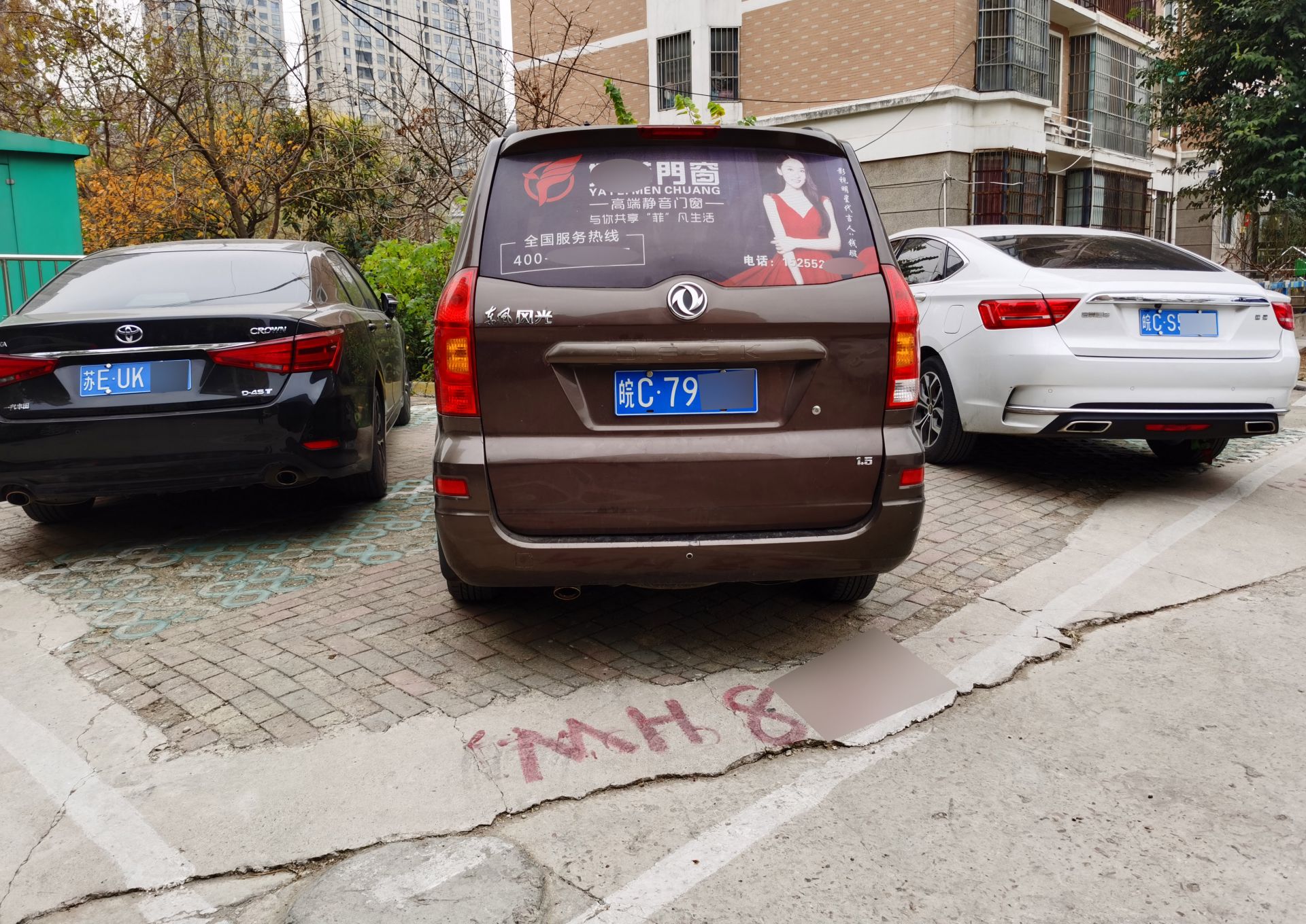 12月16日上午11时许,菱湖小区三期13栋楼下,一辆“东风风光”停在他人车位上,后车窗车贴内容相当丰富,除了商品名称、商家联系联系方式等,还有代言明星个人肖像图片。