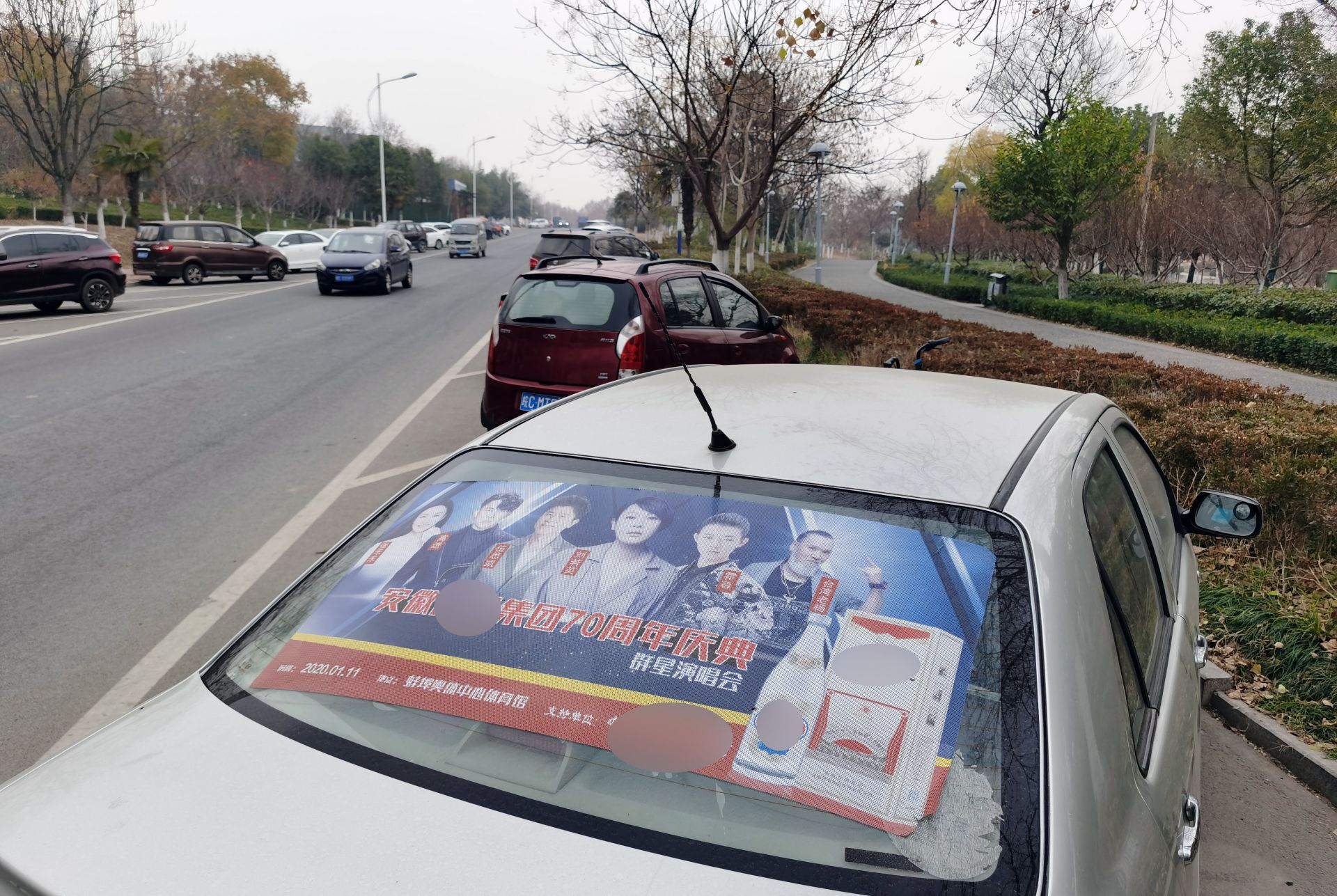12月16日,环湖西路,一停在路边的轿车后车窗设有广告的车窗贴。
