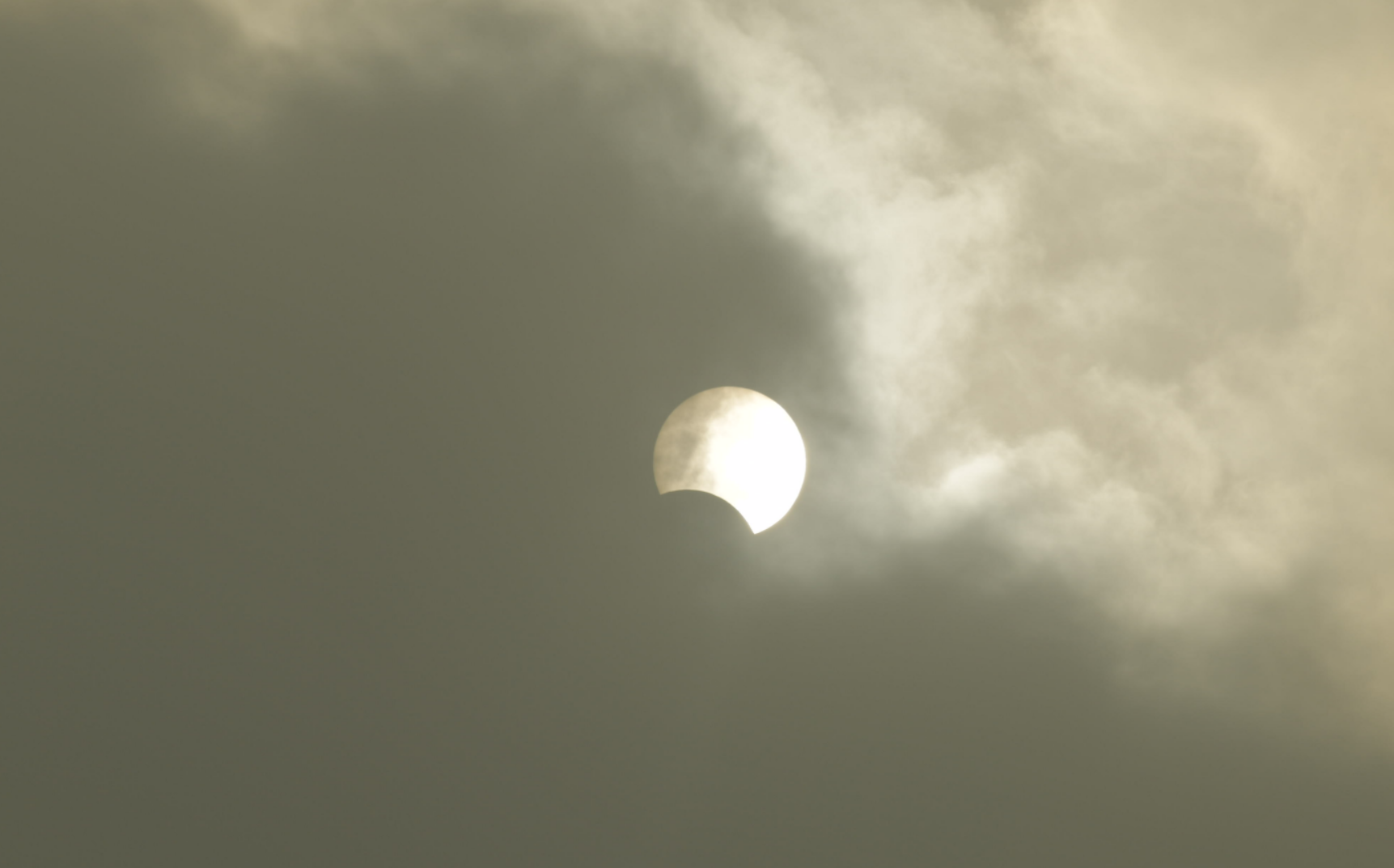 26日中午,蚌埠市出现日环食,虽然天公不作美,但市民仍然可以透过云朵欣赏到日偏食。据了解,此次日偏食是全球上演,中国日偏食开始时间为2019年12月26日10时40分左右,结束时间为15时10分左右,我国日偏食估计时长为4小时30分钟左右。(图为拍摄于26日下午2点的蚌埠日偏食)