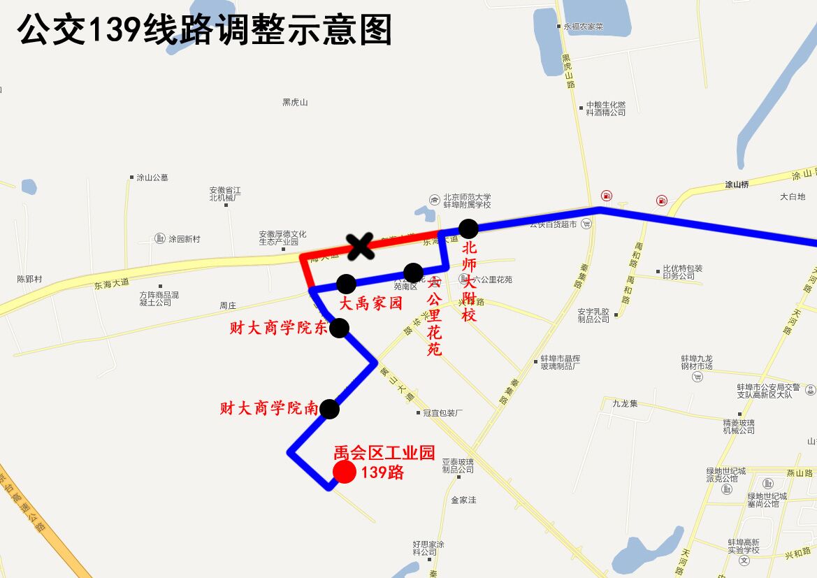 2020年1月1日起,调整公交139线路部分走向。具体调整方案是:将原139路原“禹会区工业园→兴华路→黄山大道→东海大道→原线”走向调整为“禹会区工业园→兴华路→黄山大道→兴中路→H1路→东海大道→原线”。同时在兴中路增设“大禹家园”、“六公里花苑”停靠站。