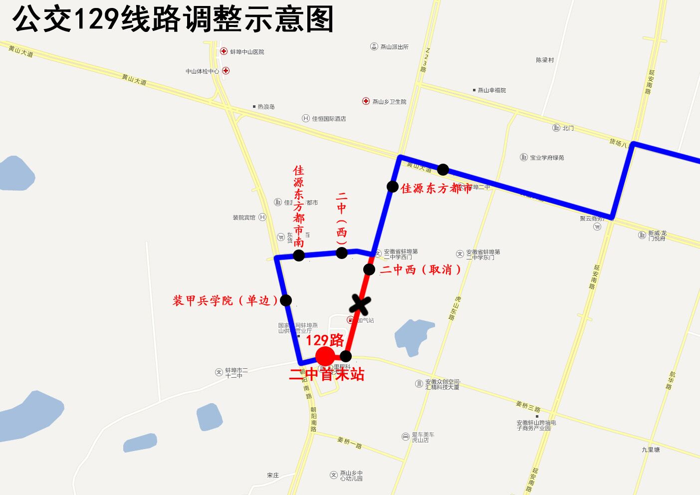 公交集团于2020年1月1日起,调整公交129线路部分走向。具体调整方案是:将129路原“二中→Z23路→黄山大道→延安路→原线”走向调整为“二中→朝阳路→Z字路→Z23路→黄山大道→延安路→原线”。同时在朝阳路增设“装甲兵学院(单边)”停靠站;Z字路增设“佳源东方都市南”、“二中(西)”停靠站。取消Z23路“二中(西)”停靠站。