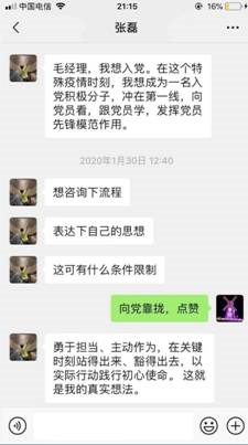 上图中这篇入党申请书是一名90后写的,他叫张磊,淮北市分公司理赔中心一名查勘定损员。在如此严峻的疫情时刻,他主动向党组织靠拢,并用实际行动践行初心使命。就如他所说的“勇于担当,主动作为,在关键时刻站得出来,豁得出去”,他是这么想也是这么做的。为确保理赔服务不中断,他主动要求值班到岗,冲在一线,成为逆行中的一员。